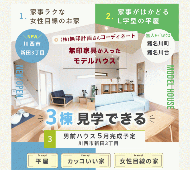 「平屋」「男前ハウス」「女性目線の家」とそれぞれ違うコンセプトのお家がご覧頂けます。