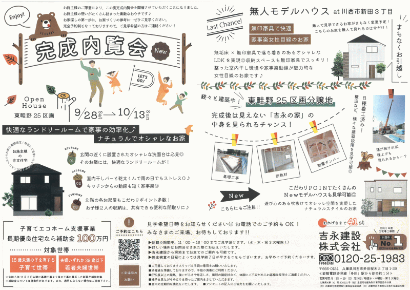 吉永建設では、無人モデルハウスや平屋のモデルハウスもご見学頂けます。